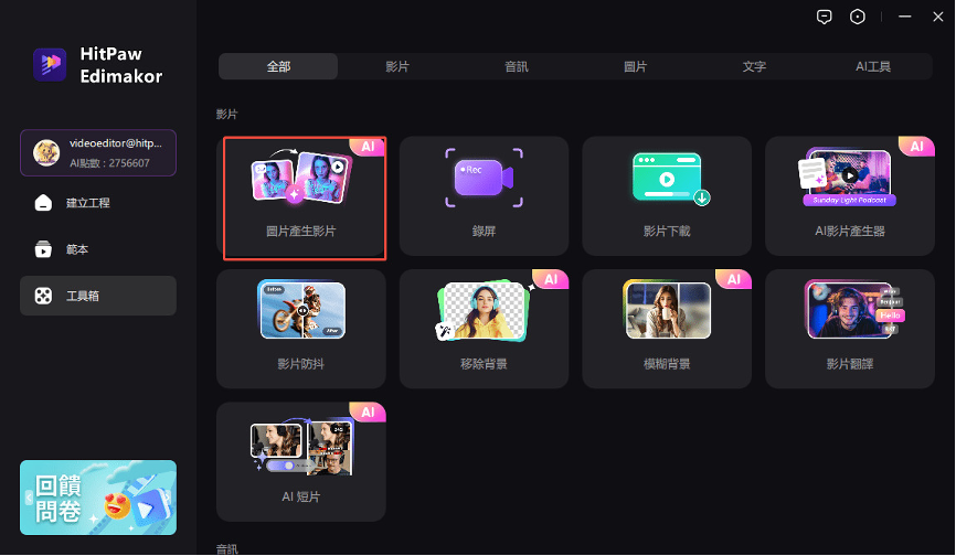 那麼我們就開始實際操作比較多台灣人在用的軟體吧!Edimakor 因為有支援繁體中文同時操作又很簡單,所以幾乎大部分台灣用戶都選擇使用它,也成為了 2025 最受歡迎的 AI 繪圖產生器之一。它內建的功能相當多元,讓你在製圖方面可以一款軟體就完成所有編輯部分喔!