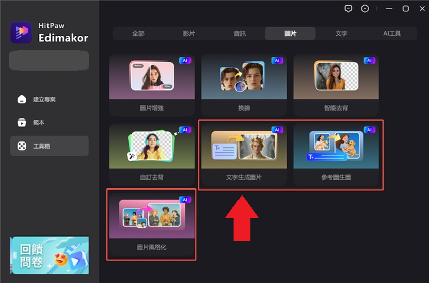 首先我們開啟 Edimakor AI圖片產生器,你可以點選左側的工具箱選項,選擇 AI 圖片的圖片生成器並選擇創作方式。
