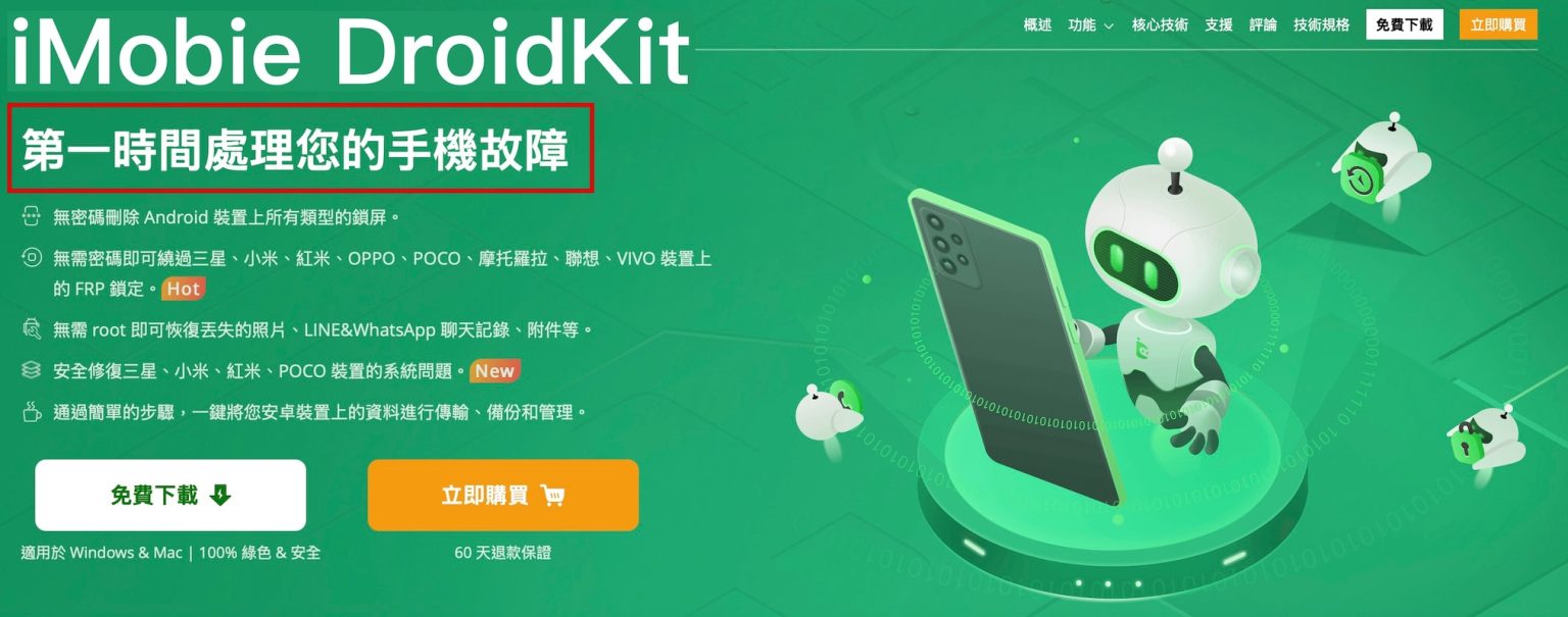 想找一款能一次解決各種 Android 問題的工具嗎?DroidKit 是由 iMobie 推出的全能型 Android 修復軟體,能幫你解除螢幕鎖、救回遺失資料、修復系統錯誤、甚至取出 Google 帳號鎖。本篇實測帶...