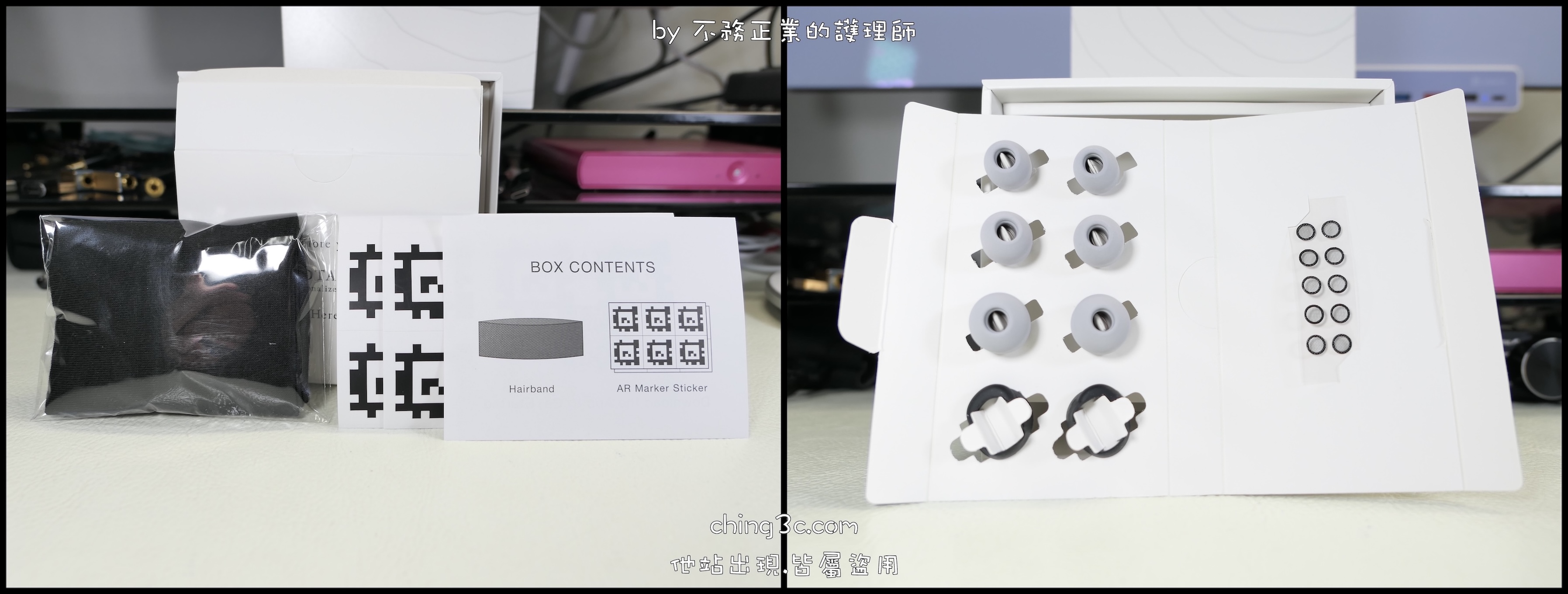左邊頭帶與 AR 偵測貼紙會在 DTAS* 設定裡用到。右邊為 S / M / LL 耳塞、 M 號耳塞鈎。FUSION-G 耳塞不建議擠壓後塞入耳道,若您覺得略大,請直接更換小號。請注意不能用酒精擦哦!⚠️