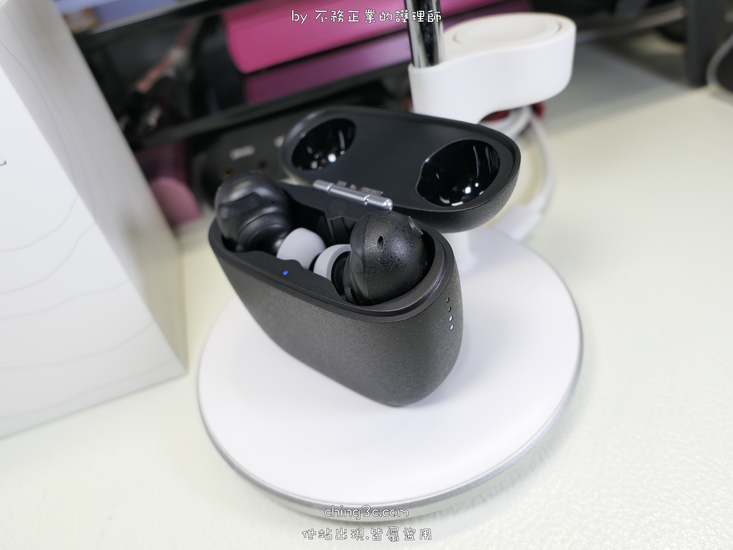 充電警示燈在側邊。此警示燈只顯示充電盒電量,耳機本身電量得依靠裝置( APP 內)。