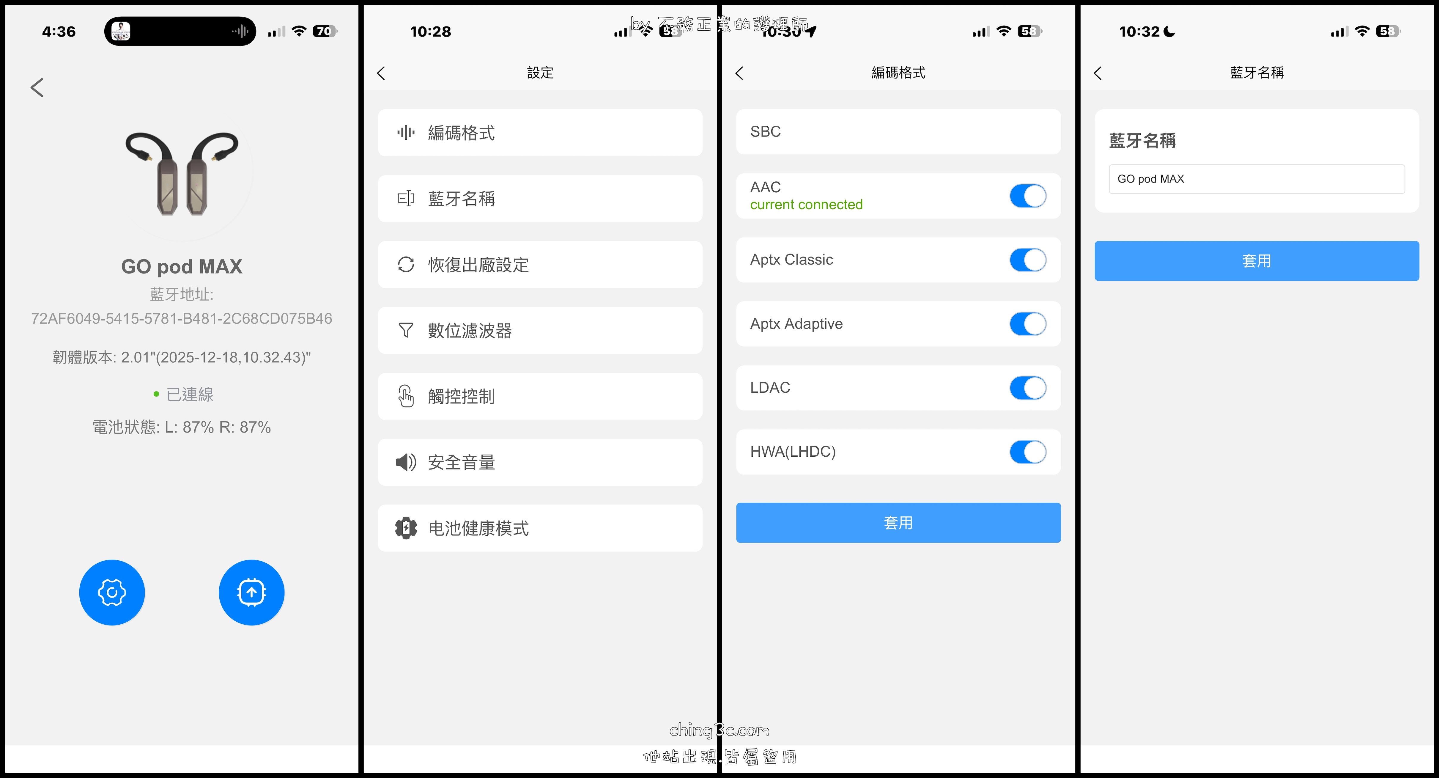 關於藍牙編碼,玩家是可以全面點開的,除非您想用低延遲模式來因應遊戲。「iFi GO pod Max」會自動偵測手機端,對接到手機原本的設定,而同時您為聽到語音播放目前編碼。