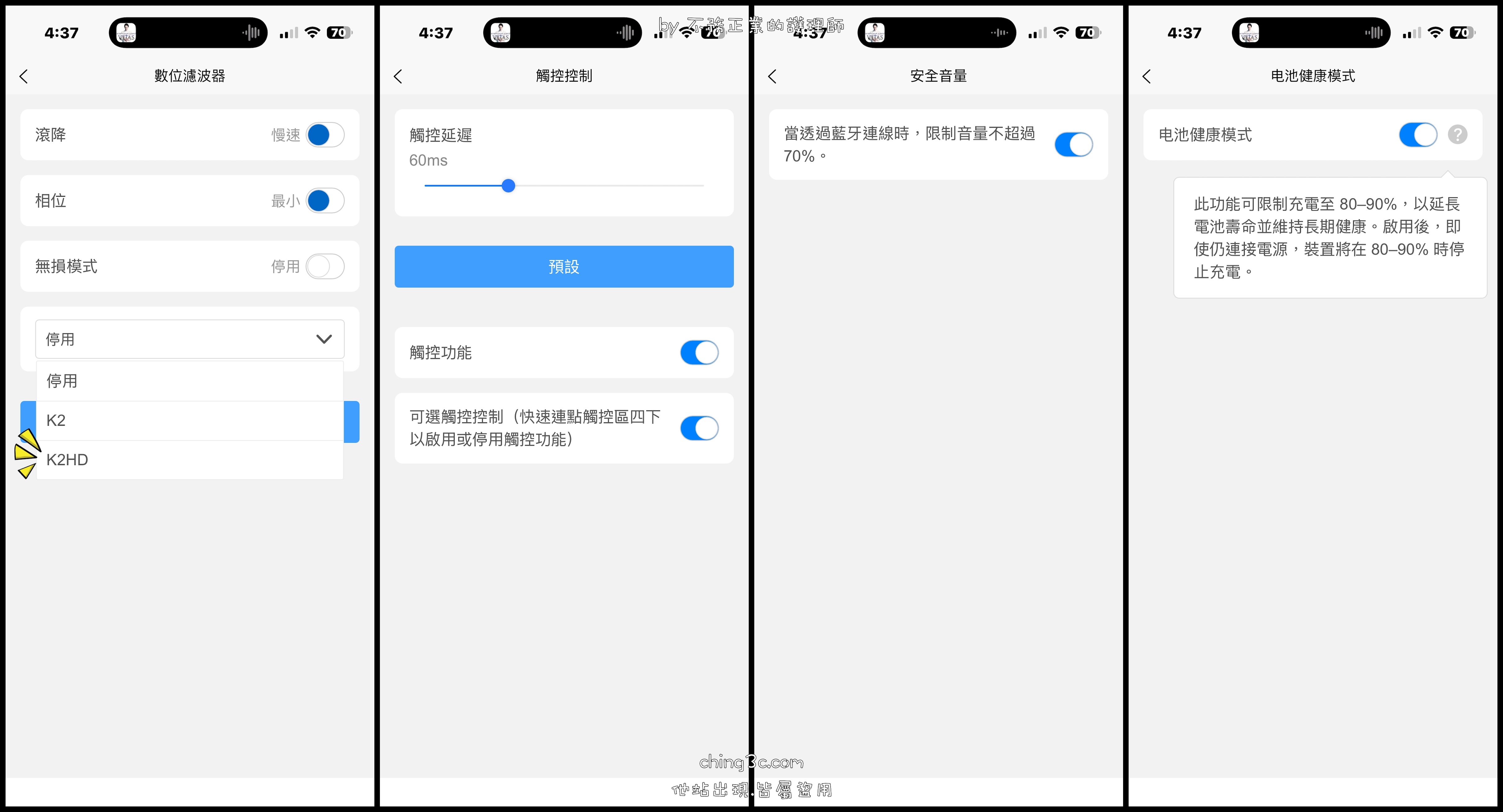 - 相位:最小相位適合追求音樂流暢度者,而線性相位則偏好精準重播。