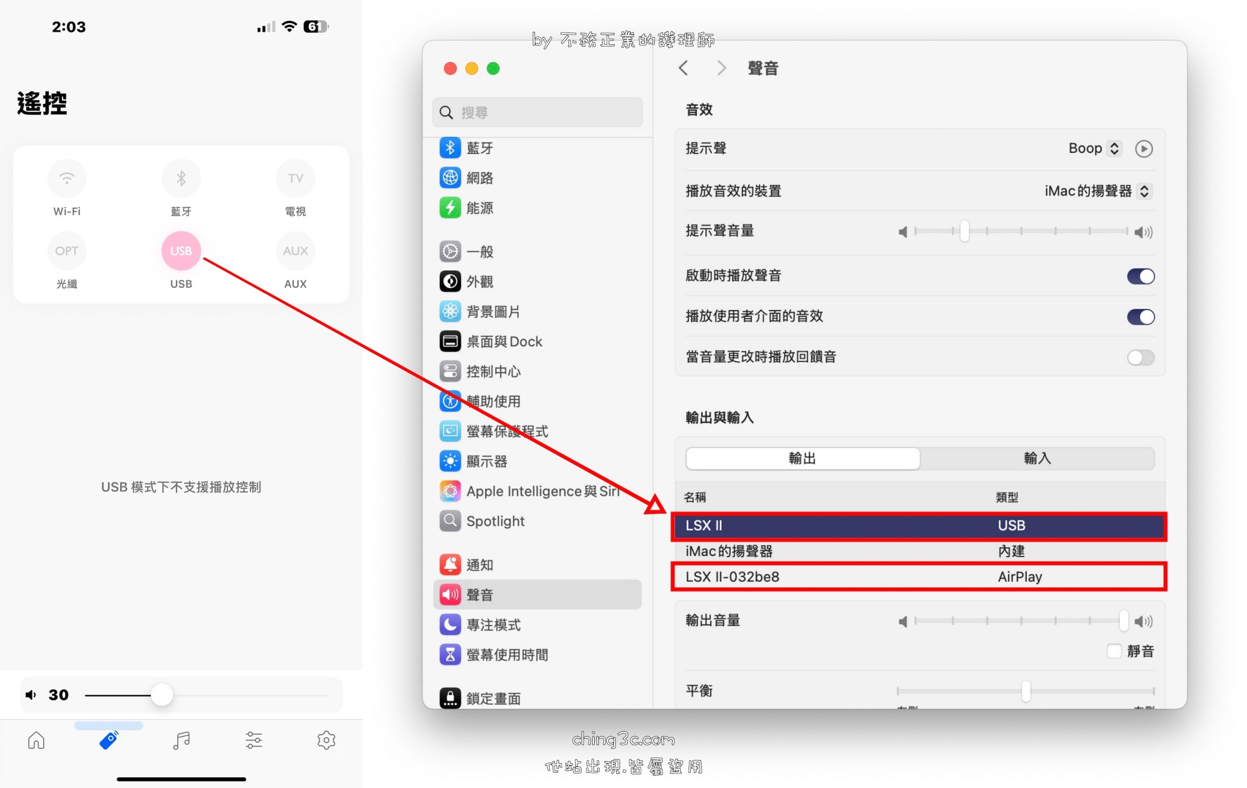 「LSX II」在 iMac 電腦上會同時出現 AirPlay 與 USB 二種模式, Mac 用戶可自己決定如何使用。