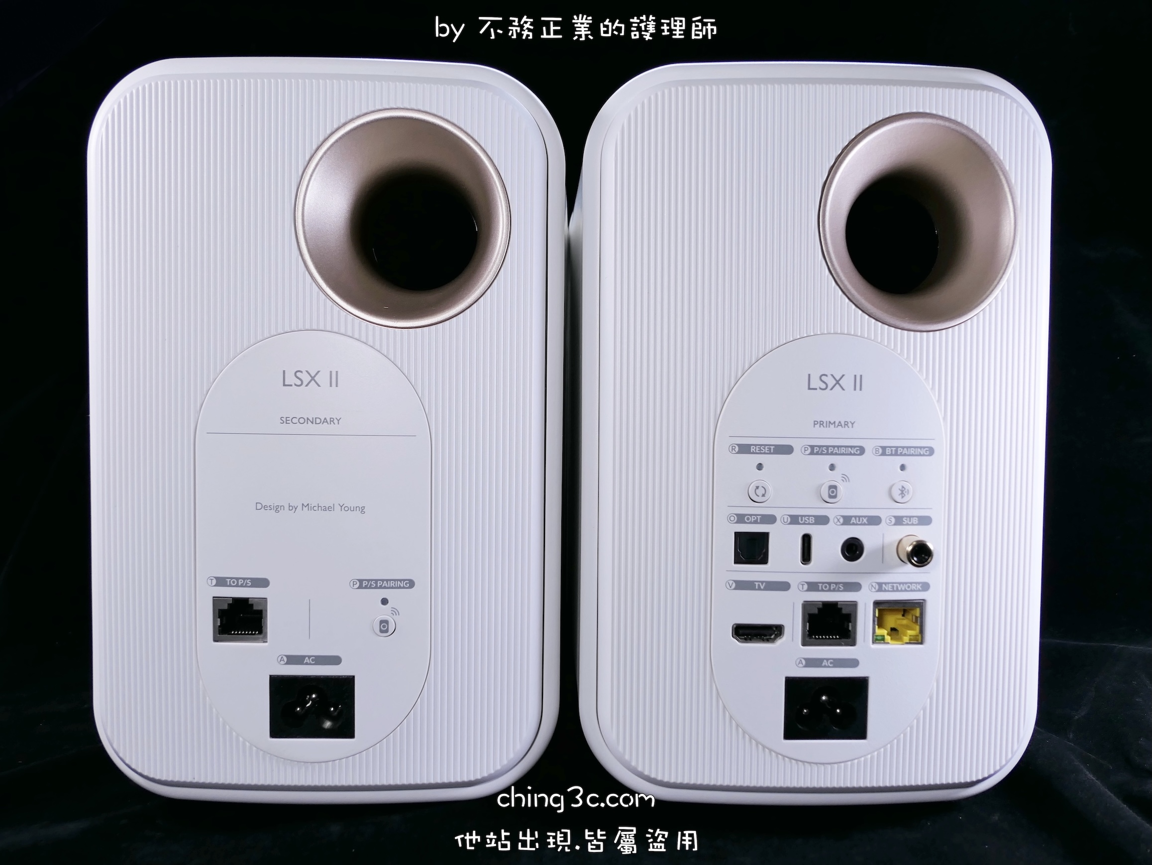 有線輸入包含 HDMI、光纖、USB Type-C 、3.5mm、RJ45 乙太網路線,而另外一個 RJ45 乙太網路孔則用於主副喇叭間的相連。故「LSX II」也可以直接利用在電腦、電視、音樂播放機上。