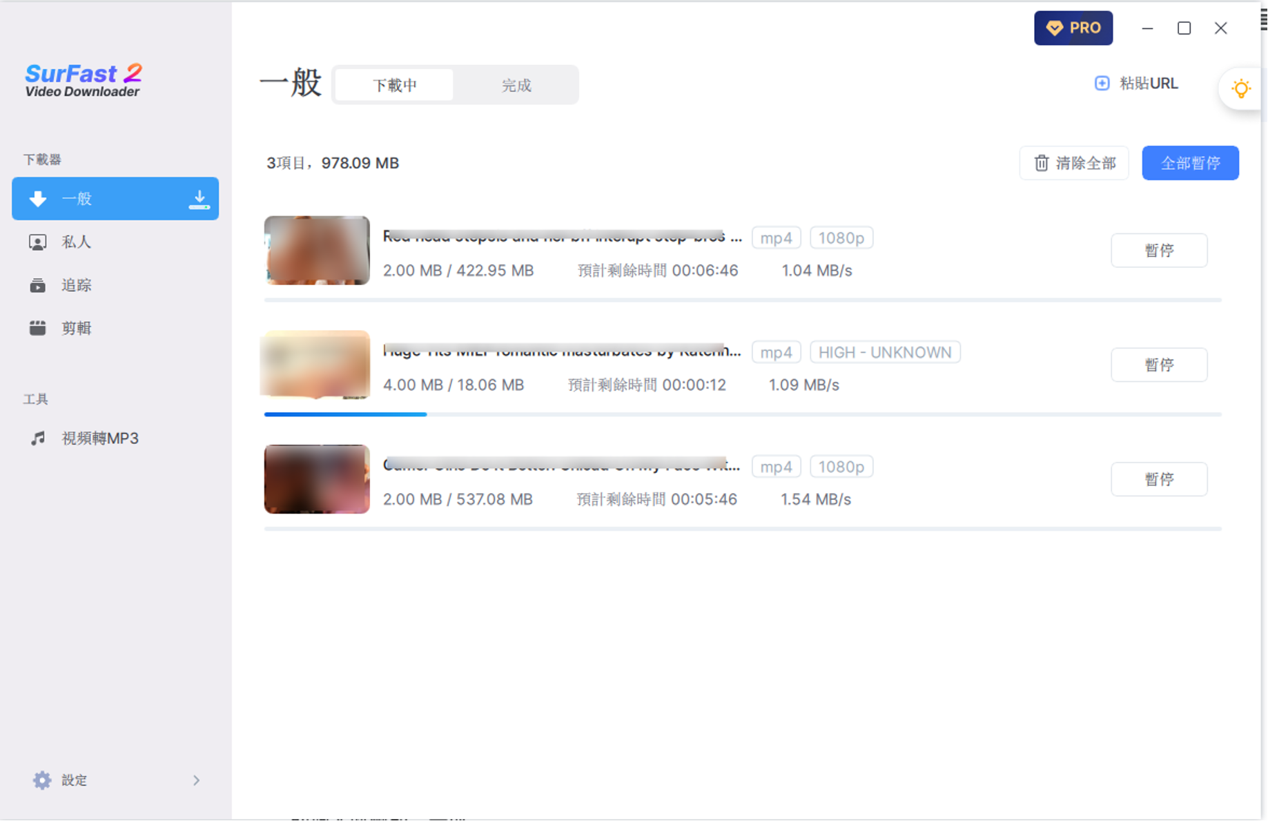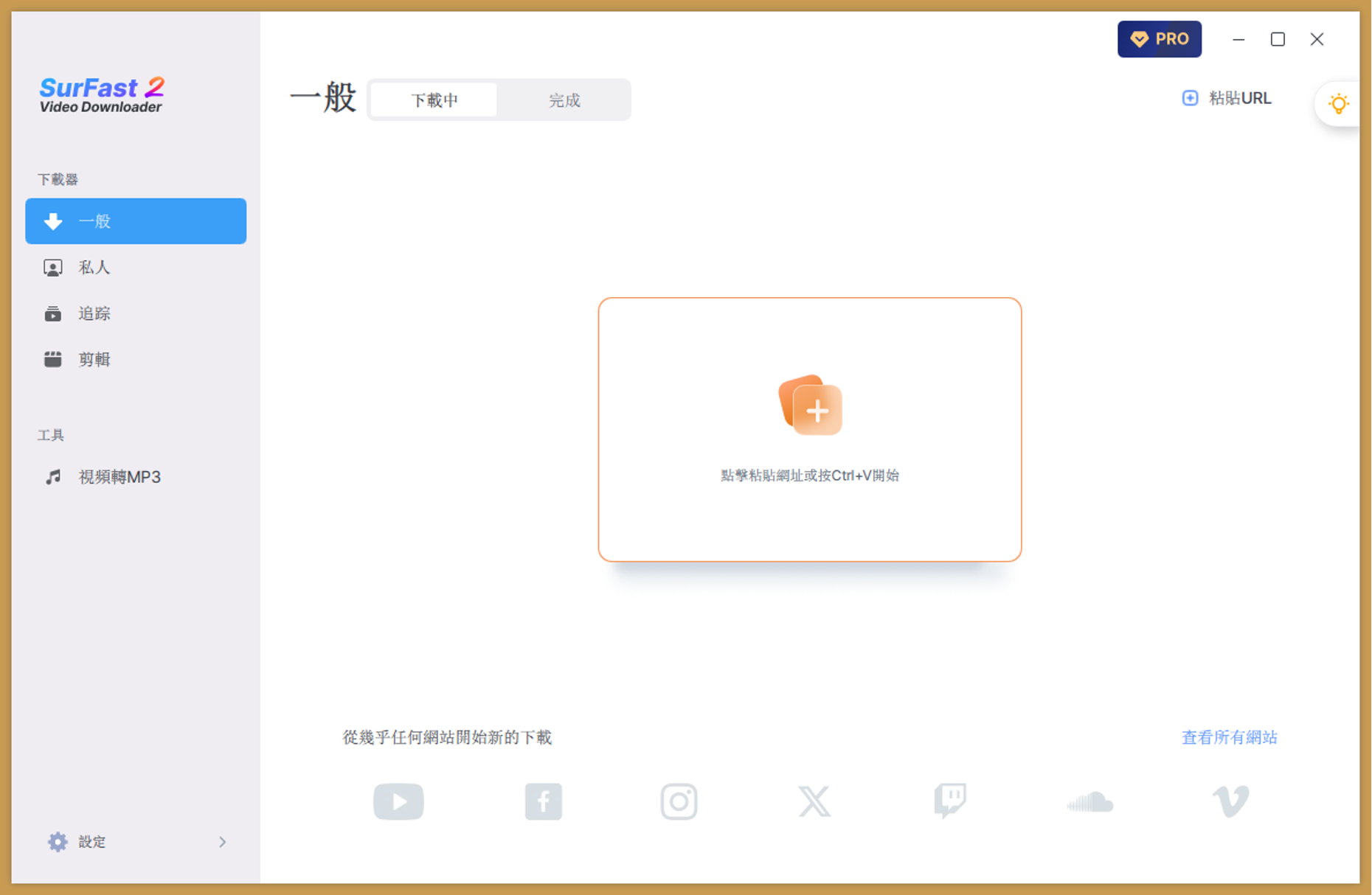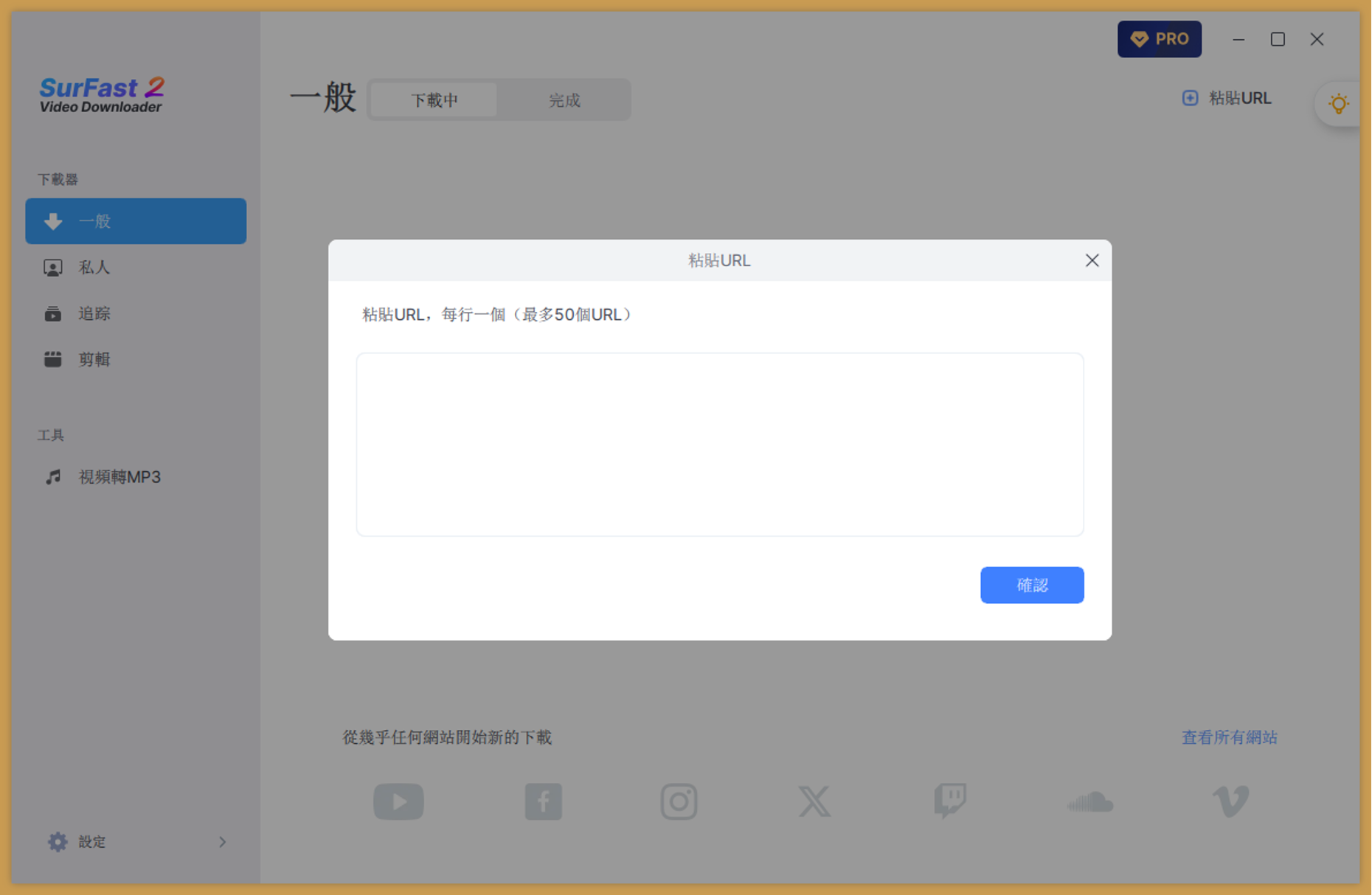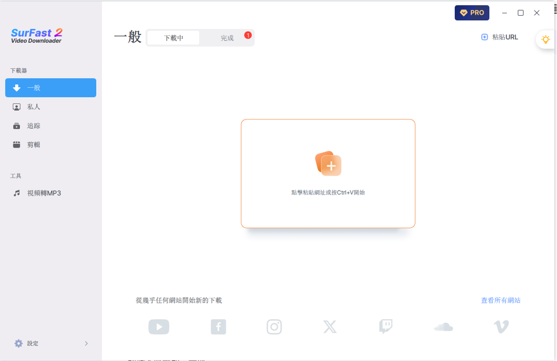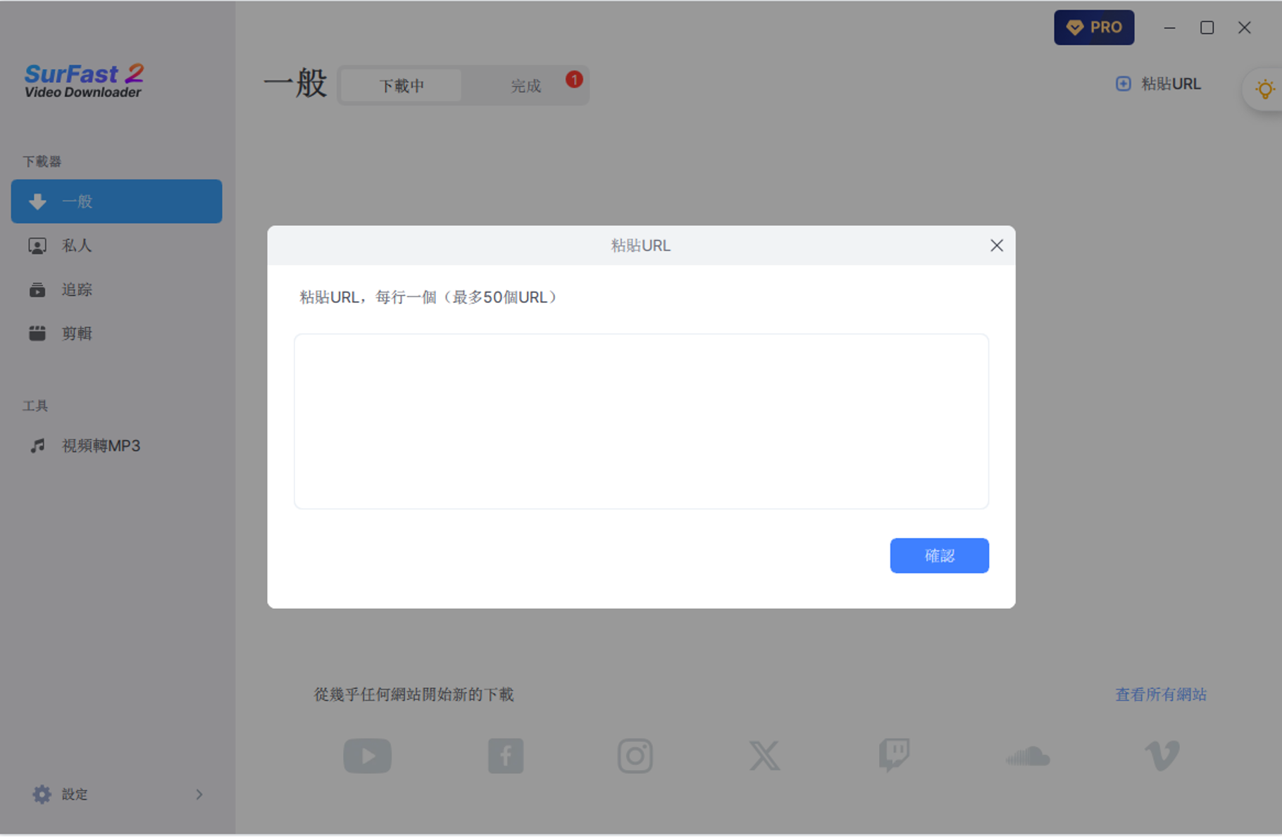 步驟二:切換至 SurFast Video Downloader,在「一般」畫面直接貼上 URL(Ctrl+V / Cmd+V),一次可貼多個 URL,程式會自動開始解析。