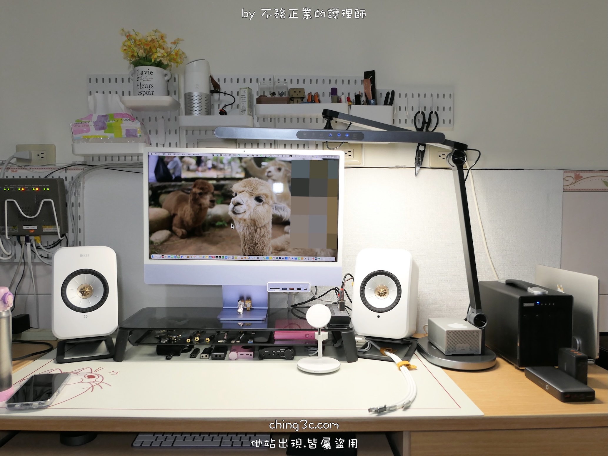 電腦桌是自己設計的,長度 140*60cm 的桌面,且拉開鍵盤也能清楚照亮。這與使用螢幕掛燈時,在感受上,有著鮮明對比。