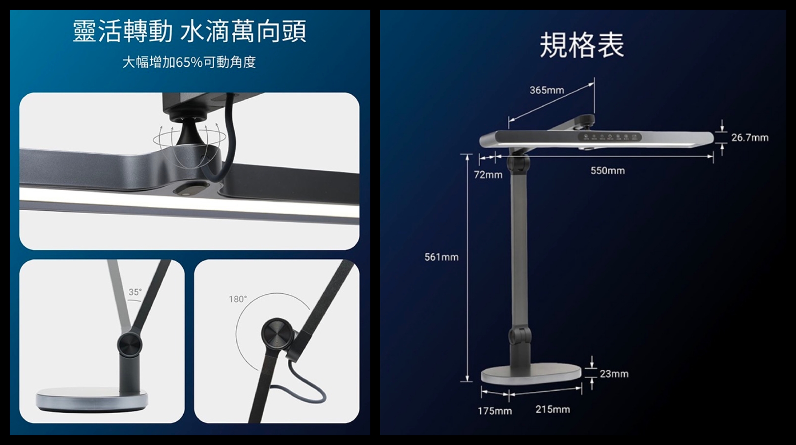 | 機構設計/可調節性 | 具穩固底座防傾倒,適合兒童使用。雙軸燈臂搭配水滴萬向頭,可多方調整。燈頭面大且外型較輕薄 ; 但整體重量較重(6.5kg)。 | 符合兒童人體工學,可調高度/角度/旋轉。雙機翼式設計,燈頭靈活,外觀體積較大 ; 但整體重量較輕(4.7kg)。 |