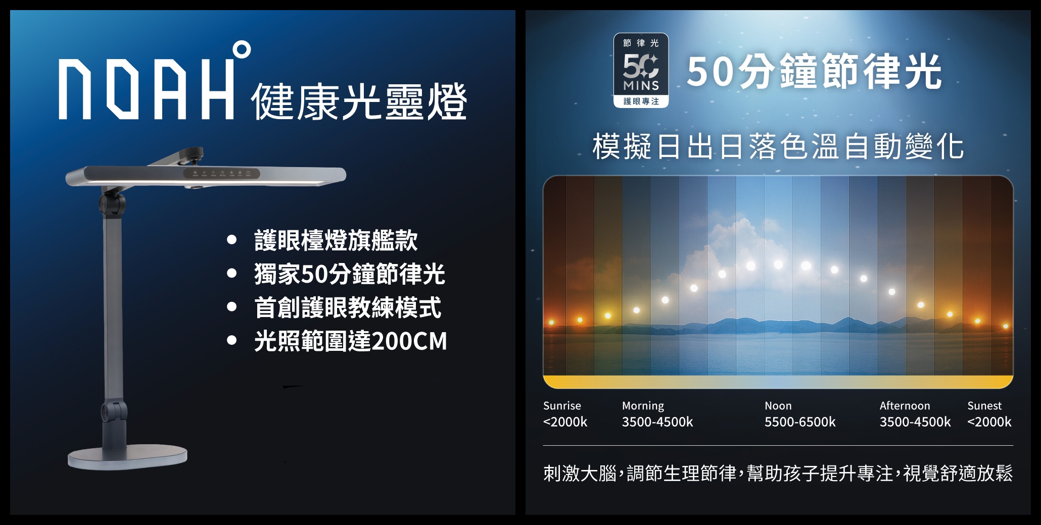 | 色溫與亮度調整能力 | 三段情境色溫、支援節律光 50 分鐘漸變(色溫自動變化)、無極調光、護眼教練模式