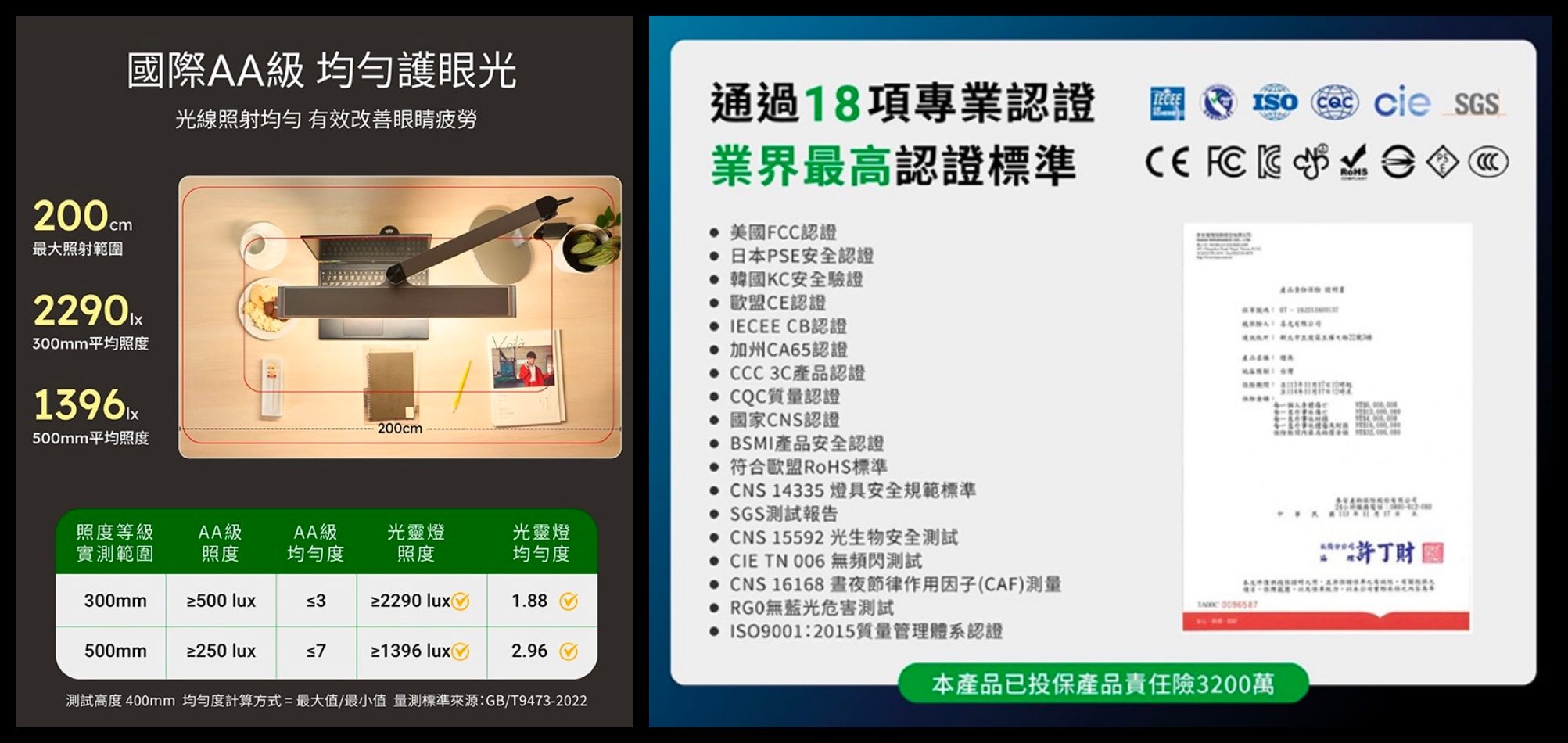 | 照度與均勻度 | 最高照度 2200lux(40cm 中心點),燈頭面積大提供 200cm 廣角照明,微導光專利技術, AA 級均勻度,適合大桌面無暗區。 | 1000lux(40.8cm 中心點), 照射範圍 120cm ,超長機翼燈頭拓寬範圍, AA 級均勻度,光束導向確保均勻。未強調最高 lux 值,聚焦防眩光分佈。 |
